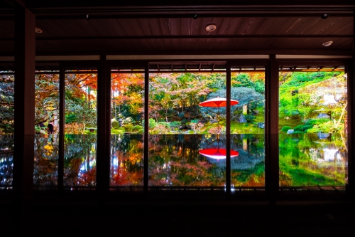 また春には青もみじ、秋には紅葉が黒いテーブルにリフレクションする絶景が見られることでも人気です。