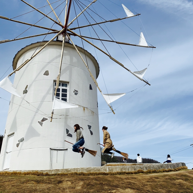 小豆島のシンボルとして知られるギリシャ風車は、小豆島とギリシャのミロス島の姉妹島提携を記念して建てられたもので、風車のまえでの撮影用にホウキを借りることもできます。そのほかオリーブ色のポストもあり、写真撮影にぴったりのフォトスポットがたくさんあります。家族みんなで楽しんでくださいね!
