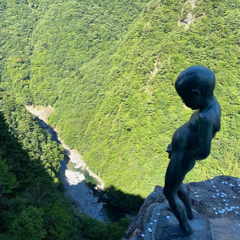 高さ200mの突き出た絶壁の岩にたつ「小便小僧」の像は、もはや祖谷渓のシンボル。「その昔、地元の子どもたちや祖谷渓を訪れた旅人などが、この辺りの断崖で度胸試しを行った」という逸話を元に作られたと言われています。