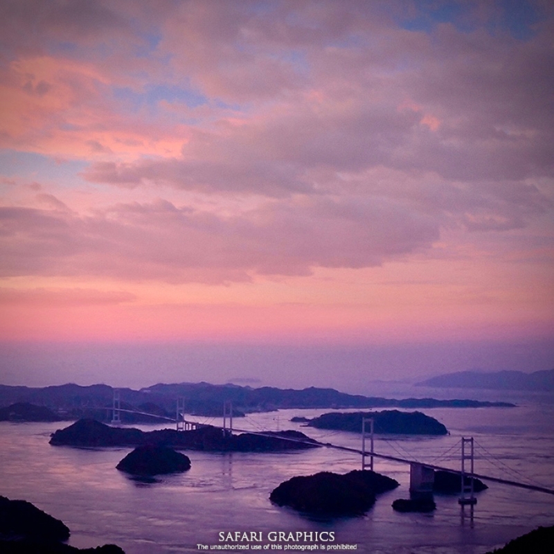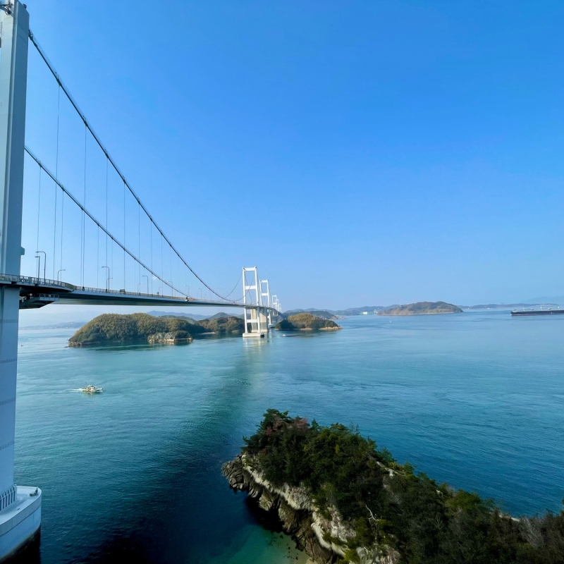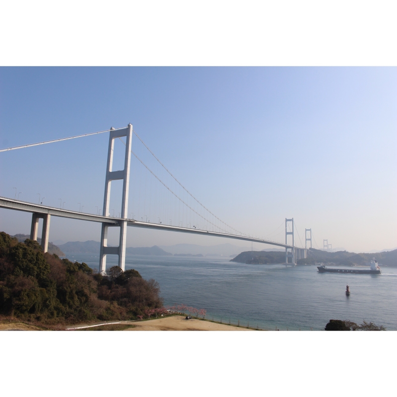 大島から武志島、馬島を中継して今治市をむすぶ、世界初の3連吊り橋で、全長は4,105m。しまなみ海道で最も長い橋です。橋の両側に小型バイク道と自転車歩行者道が設けられており、橋の上からは、景勝地として知られる来島海峡の絶景が楽しめます。