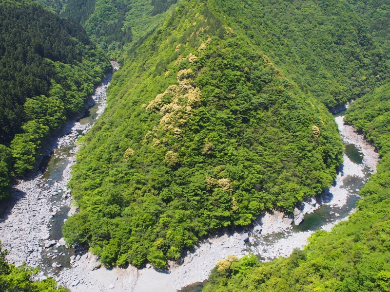 全長約10kmに及ぶ、徳島県三好市にある渓谷。場所によっては100m以上もの高低差があると言われる、深いV字谷の渓谷です。