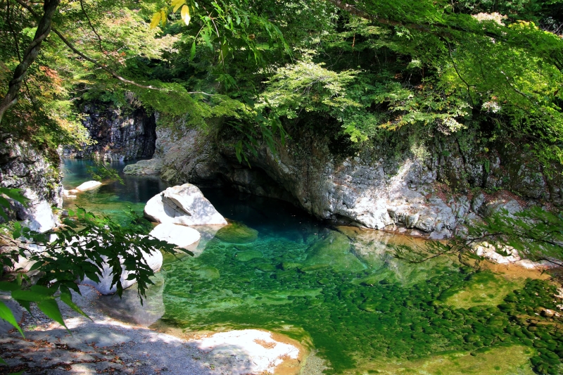 透明度が高く澄んだエメラルドグリーンの川が特徴的な「面河渓」。石鎚山の南麓に広がる四国最大の渓谷で、国の名勝にも指定されています。