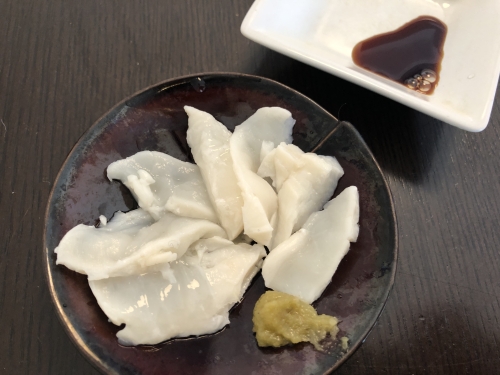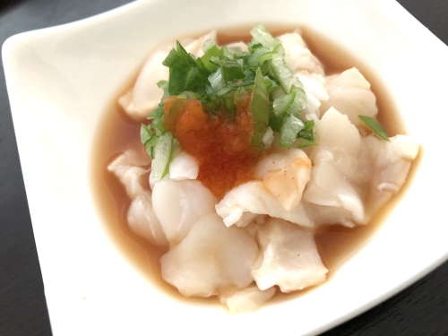 魚の腸とはいえ、さすが大きなマンボウの腸! 牛や豚のホルモン のようです。茹でるとかなり縮むのですが、お好みの厚さに切ると良いと思います。