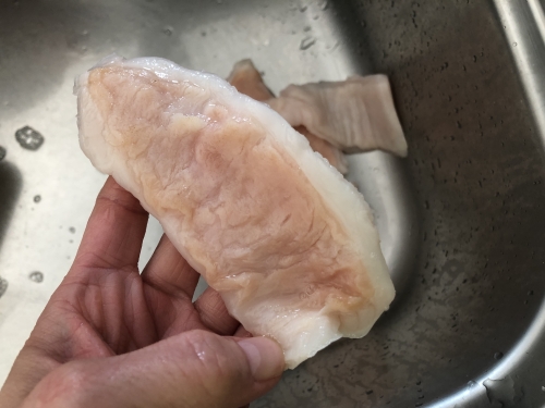 冷凍マンボウは、できるだけ冷蔵庫で自然解凍してください。というのも、マンボウは火の通し方がポイントだからです。お刺身で食べられるマンボウを出すお店もありますが、道の駅で売っているものは要加熱。そこで、一番気をつけなければいけないことは、火を通しすぎると硬くなってしまうこと。