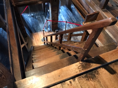 天守閣内の階段には敵の侵入時に取り外せるよう、また、防火防腐のために桐が使われています。全国でも桐を使った階段は、松江城のみです。望楼からは松江市街を一望することができます。