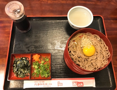 3段重ねの赤い器が特徴的な「割子蕎麦(810円)」をいただきます。食べ方もちょっと特殊で、薬味とそばつゆを直接かけて食べるスタイル。細めのコシのある麺に、つゆはうるめ鰯から出汁を取ったさっぱりした味わいです。