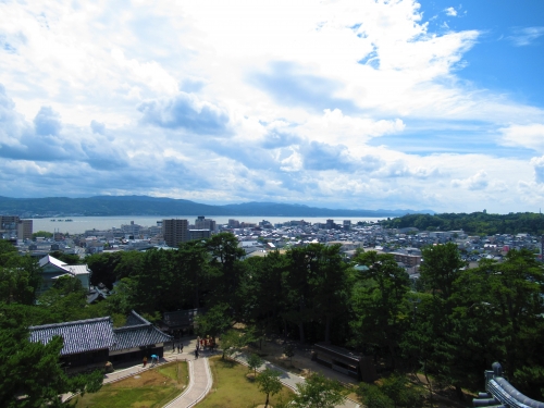 松江城の目下には、島根県一の都市である松江市街地とシジミの産地である宍道湖、宍道湖北畔に位置する松江しんじ湖温泉などが広がっています。風も通るようになっており、気持ちよく景色を見ることができますよ。