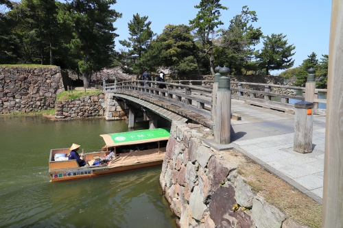 国宝・松江城を取りかこむ3.7kmの堀川を、全長約8m、幅約2mの小さな舟で約50分をかけてのんびりと周遊します。乗船場は三か所(カラコロ広場乗船場、大手前広場乗船場、ふれあい広場乗船場)あり、それぞれの乗船場にチケット売り場があります。