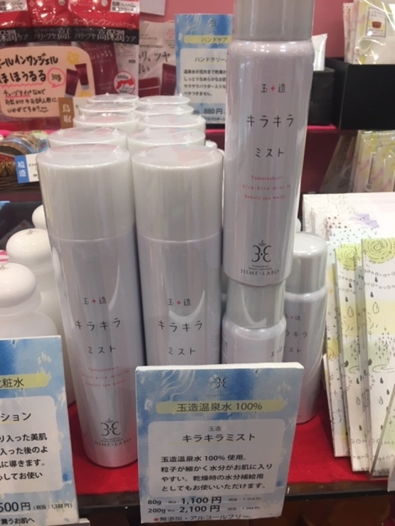 化粧品メーカーの姫ラボは、玉造温泉の温泉水を使用したコスメを開発しており、化粧水「キラキラミスト」(80g 1,100円、200g 2,100円)もそのうちの一つです。粒子が細かく、お肌に馴染みやすく、様々なシーンで使用することができます。