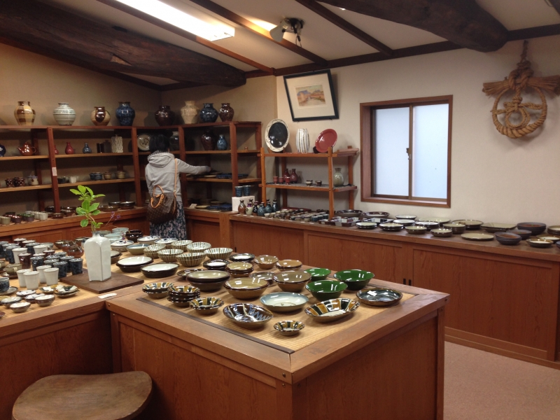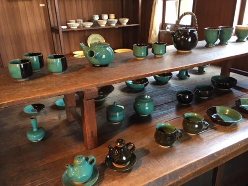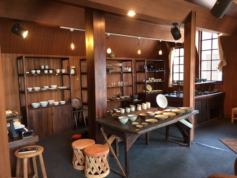 築100年以上経つ木造家屋で現在でも作品がつくられており、窯元は古民家のような雰囲気です。母屋の2階部分には、直営店があります。窯元から程近い宍道湖の365日をとらえたような淡い青色のお皿や夕日色のような明るい土色のカップ。島根の自然の四季が垣間見えるような作品です。