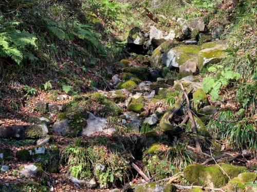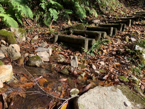 健脚コースを進んでいくと横木渡しの階段の道が出てきます。