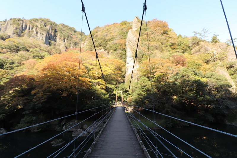 スタートして早々に、不老橋(ふろうきょう)という橋が見えます。ここから特に綺麗な奇岩群を見ることができます。岸壁との距離も近く、紅葉シーズンには木々が華やかな色合いを見せてくれます。