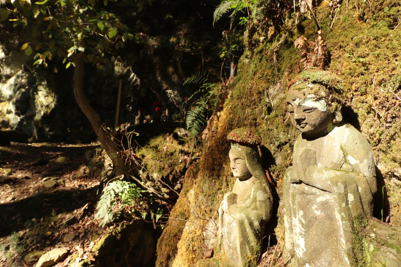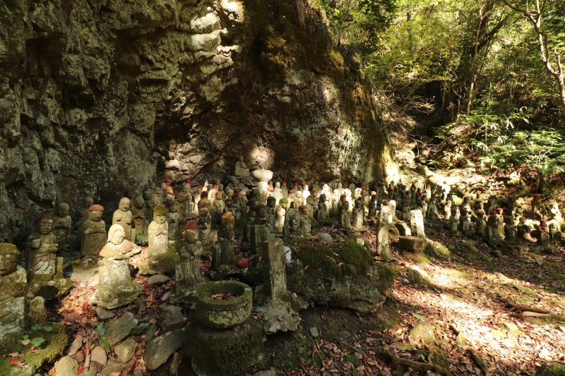 時にはゴツゴツした壁面と隣り合わせの道を歩くこともあり、スリリングな体験ができます。そうした道を進んでいると、「五百羅漢(ごひゃくらかん)」が突如現れるポイントがあり、230体余りの石仏が納められています。