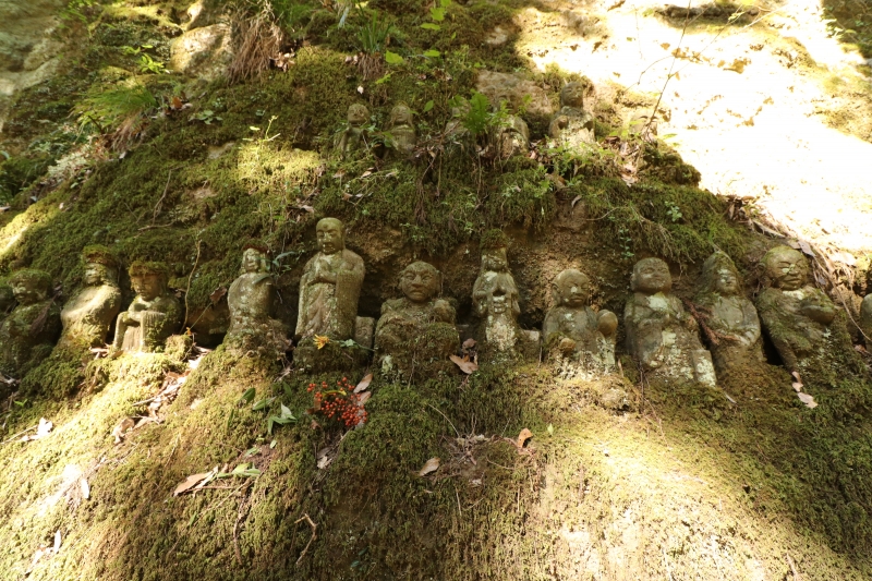 頭巾を被ったお地蔵さまがたくさん置いてあります。背の高い木々が立ち並び、景色も美しいポイントです。筆者は13~14時の間にここを通過しました。日光がちょうどよく五百羅漢に差し込んでくれる時間帯なので、ご訪問の際はぜひ参考にしてみて下さい。