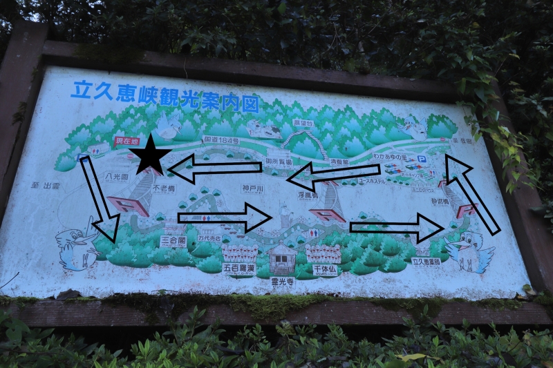 以下の地図がハイキングコースの全体像です。黒い矢印は筆者がたどったコースとなります。黒い星マークがスタート&ゴール地点(八光園)です。奇岩群はコース中ずっと続いていますが、特に綺麗に見えるポイントが二か所ありますので、以下に記載します。