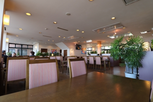 店内は家族連れも安心して訪問できる広さです。窓側の座席からは、キララビーチがよく見えます。海鮮丼のほか、蕎麦やうどん等のメニューも用意があります。