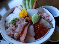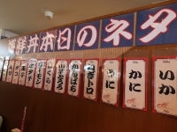 写真:Kikuchi 名物の海鮮丼は具だくさん! |  写真:Kikuchi 広さのある店内(海鮮丼屋ごゑん) |  写真:Kikuchi 窓際に座ればキララビーチがよく見える |