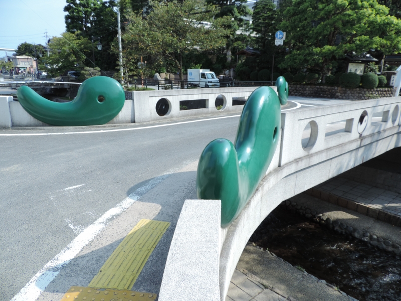 玉造温泉のシンボルと言える橋。こちらの橋には、玉造温泉の各所にある勾玉の中でも一番サイズの大きい勾玉が4つつけられており、絶好の記念写真の撮影スポットです。これだけ大きな勾玉の前で写真を撮れば、幸せが訪れそうですね。