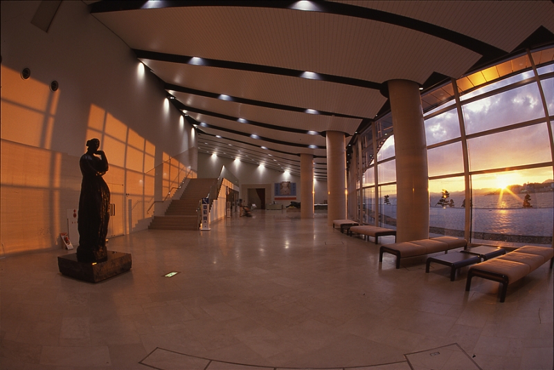 無料で開放しているロビーは全面ガラス張りになっており、”日本の夕日百選”にも選定されている宍道湖の夕日を眺める絶好のスポット。また野外彫刻作品の「宍道湖うさぎ」では、宍道湖側から数えて2番目のうさぎに、西を向きながら触ると幸運が訪れるという噂があります。