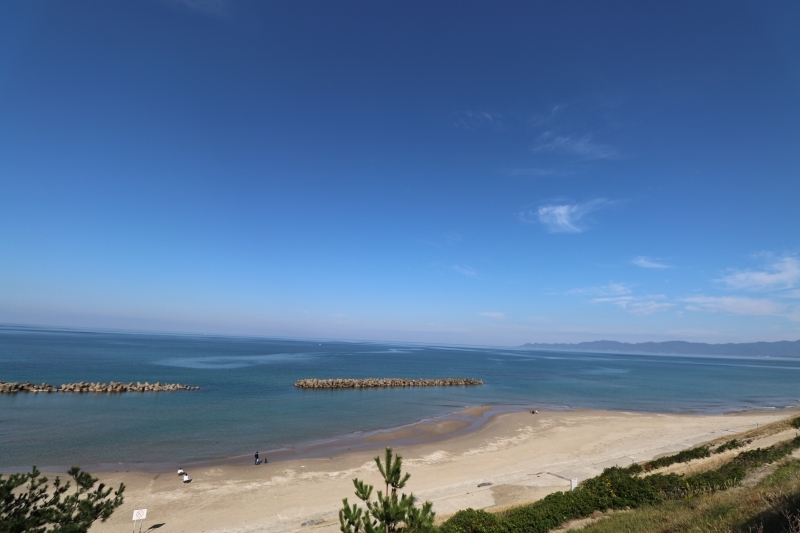 道の駅キララ多伎のすぐ目の前に広がるビーチ。砂浜は白く、海の水は透明感があり、日本海の美しさを堪能できます。またこのビーチから眺める夕日は絶景で、「日本の夕陽百選」にも選ばれています。