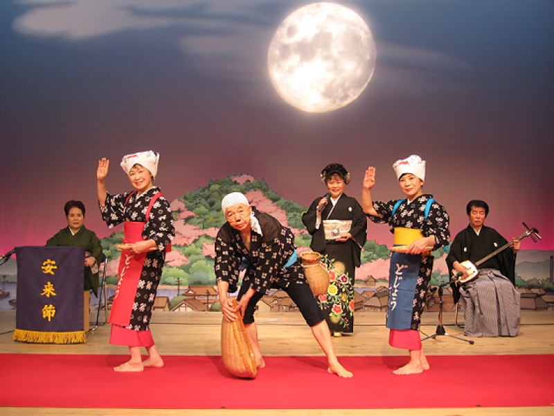 安来節は元々、島根県安来市の民謡で、踊りはこの地方の名物であるドジョウを捕まえる時の面白い動きのマネを取り入れました。地元で人気を博したこの組み合わせは出雲から全国へ巡業するようになり、その滑稽な動きで大正期には全国的に人気を誇りました。