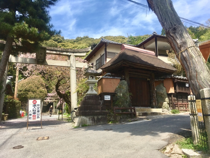 参道を登りきると銀閣寺です。登山口へは、銀閣寺を正面に見て左へ歩きます。八神社という神社の鳥居が見えたら、鳥居はくぐらず、道なりに右へ進みます。