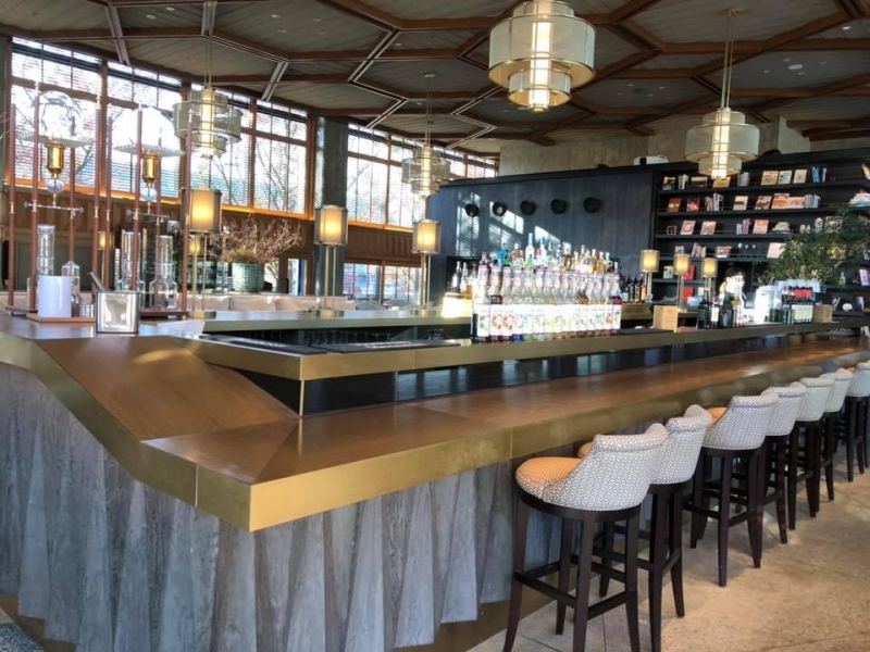 店内は日本を代表するモダニズム建築をリノベーション。バーカウンターをはじめ、高い天井と窓に囲まれた開放感の空間で食事を楽しむことができ、壁側には1階にある「蔦屋書店(つたやしょてん)」でセレクトした本が並んでいます。