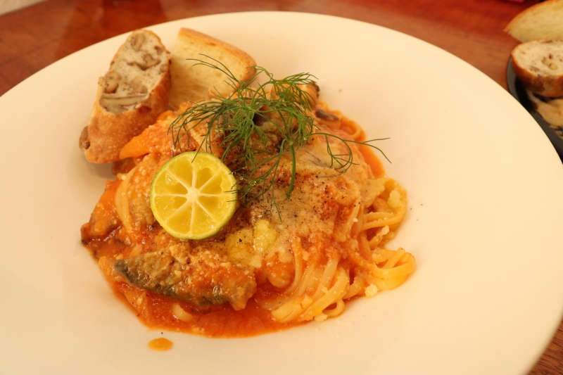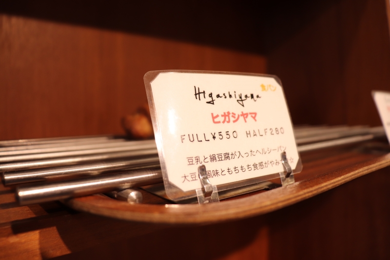 パスタには自家製パンが添えられており、こちらも絶品です。レジの横にパンコーナーがありますので、気に入られた方はお帰りの際にテイクアウトすることも可能です。特にパスタに添えられていた「ヒガシヤマ」は、これ以上ないくらいのしっとりした舌触りのパンで、ここでしか味わえない独特の商品です。原材料にお豆腐を使用しているのがポイントなのだとか。