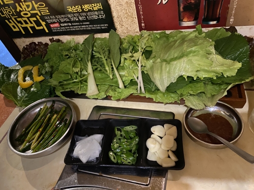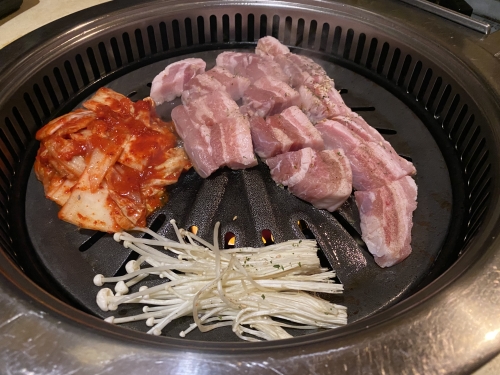 豚バラ肉を使用したサムギョプサル(¥1,540)が1番人気。王豚足家のサムギョプサルは、とても肉厚なんです。サムギョプサルをオーダーすると、お肉と一緒に焼くキムチ、えのきの他に、エゴマの葉やサンチュウなど12種類も入った、新鮮な野菜プレートも付いているんです。シャキシャキの野菜にジューシーなお肉、ニンニクやキムチをのせて頂きましょう。