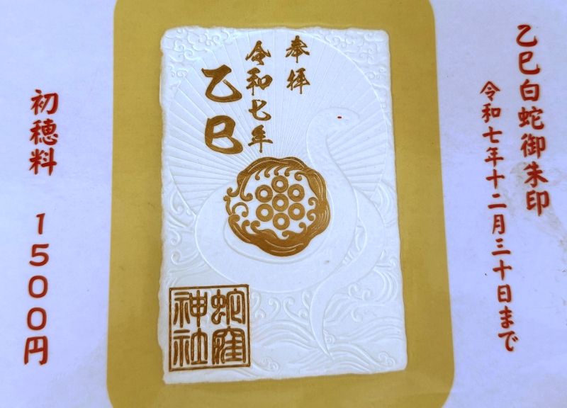 正月期間1月1日~11日(2月28日(金)迄延長)と通年の巳の日に、天然記念物山口県「岩国のしろへび」の脱皮と、護符を納め合わせた「夢巳札(ゆめみふだ)」などの頒布もあります。