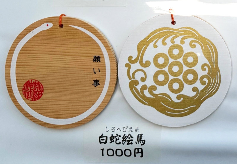 白地に金社紋が入った「白蛇絵馬」。願い事を書く面は、可愛い赤目の白蛇に囲まれたデザインになっています。