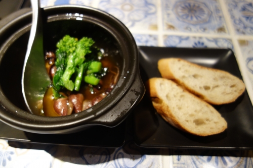 お通しのレバーペーストとカリカリのバゲットは、お通しとは思えない本格的な味!