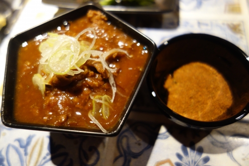 野菜スティックは見た目も鮮やかで、オリーブオイル味の箸休めに最適。もつ煮込みも外せない一品。たっぷりのモツに濃いめの味はお酒が進んでしまいます。