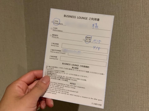 最初の利用時にルームキーを提示し、「ビジネスラウンジご利用書」に必要事項を記入すれば、その後は受付で利用書の提示のみで滞在期間のあいだ何度でも利用できます。