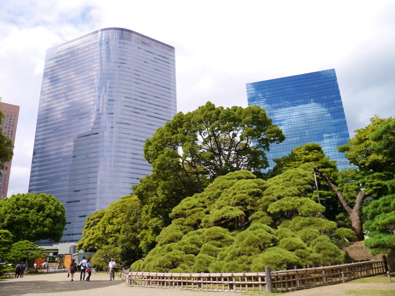 日本の伝統を感じる庭園からのぞむのは、汐留エリアの近代的な高層ビル群。この、ギャップがありながらも美しい景観が浜離宮恩賜庭園の大きな特徴です。