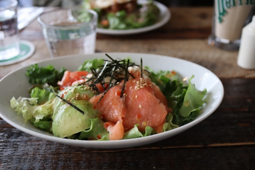 ここのカフェ、どれも美味しいのですが特におすすめしたいのは、野菜がたっぷり摂れるアボカドとサーモンのチリマヨ丼。酸味の効いたソースが食欲をそそります。また、特製タコライスも甘めのタコミートと半熟の目玉焼きの相性がバツグンです。