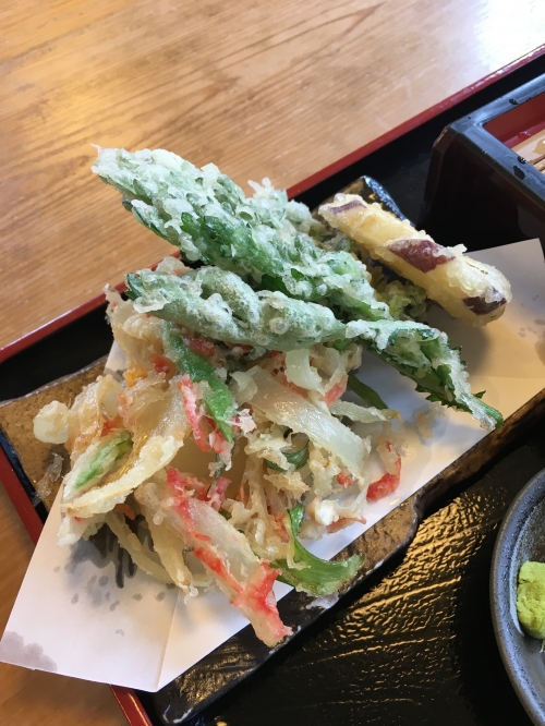 天もりそば(900円)には、地元野菜が使われた天ぷらがたっぷりついてきます。田舎そばと違い、麺は石臼挽きの湧水そばで、艶やかな色合いと舌触りです。