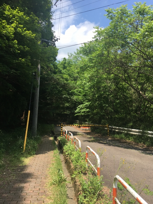 登山口には、「一般車両通行止め」のバーがありますが、これを越えて進んでいきましょう。しばらくは舗装された道が続きます。