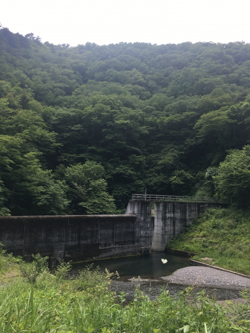 少し歩くとダムのようなものが見えてきます。さらに道なりに進むと、看板が見えてきますので、いよいよ山の中へ突入です。