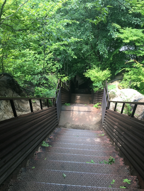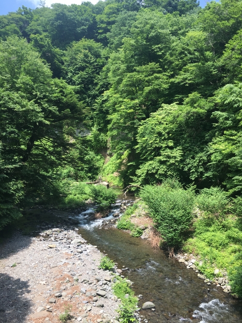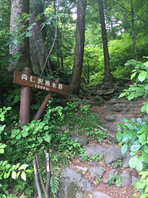 長い階段を下り終えると、が見えてきます。そこから見下ろすと、ひときわ青い尚仁沢川を眺めることができます。さらに進むと川の近くまで降りてきます。