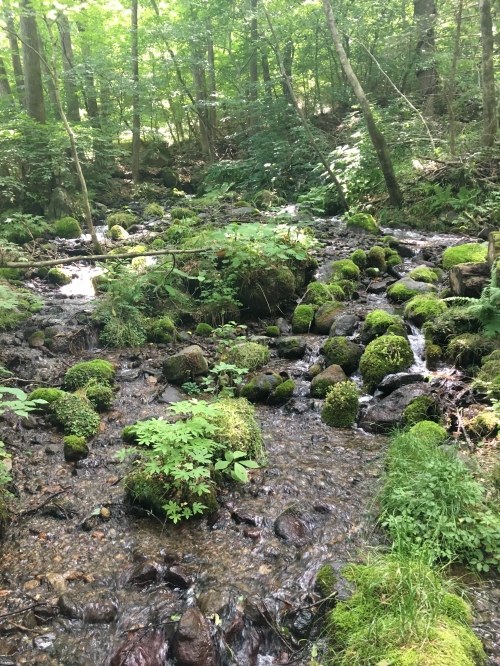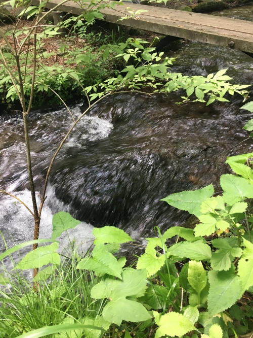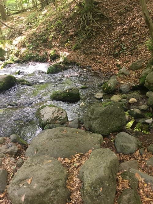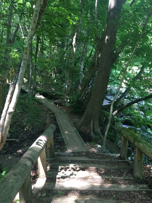 途中歩きやすいように、木の板で道が作られている場所もあります。また、上流に近付けば近付くほど、苔むした岩々が増えてきます。