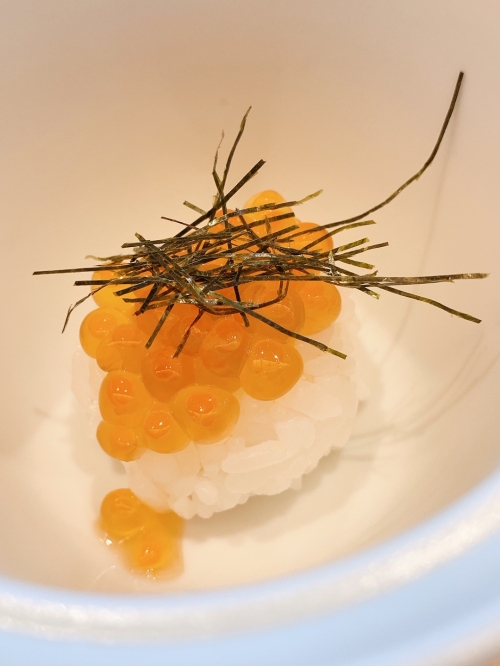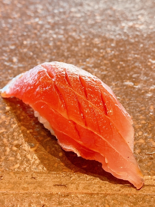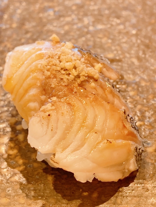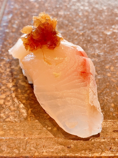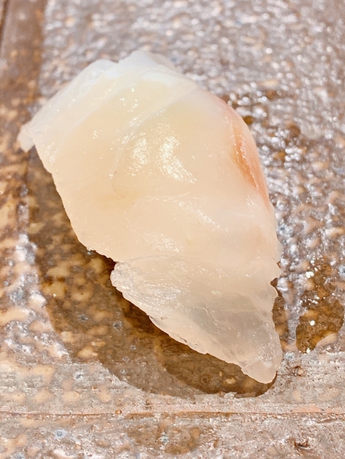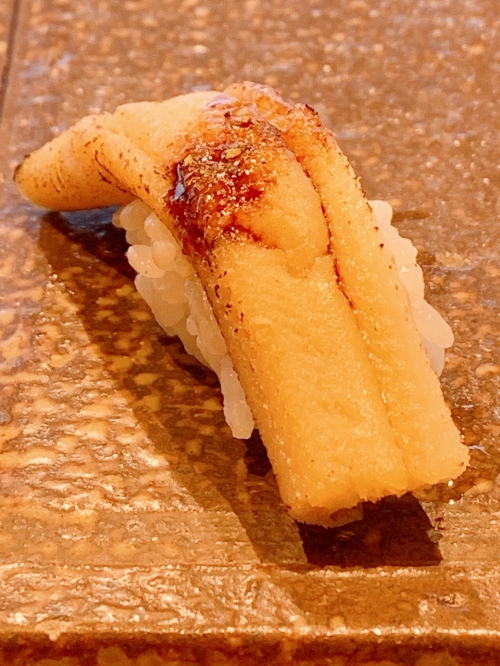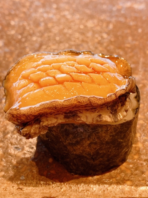 お寿司とともに存在感があったのが、「アワビの白ワイン蒸し」です。アワビをお寿司でいただく時のコリコリとした食感とは違い、蒸されることによって、弾力がありつつも柔らかさが出てきます。玉ねぎや煮汁まで美味しくいただけます。
