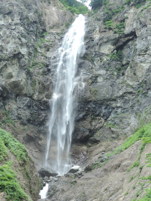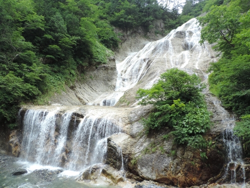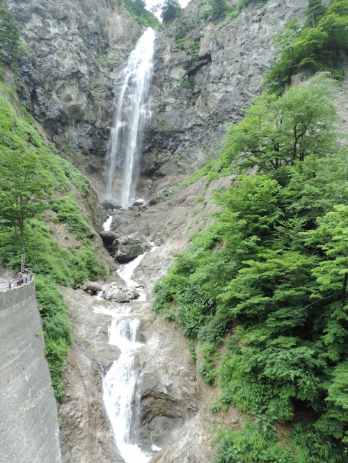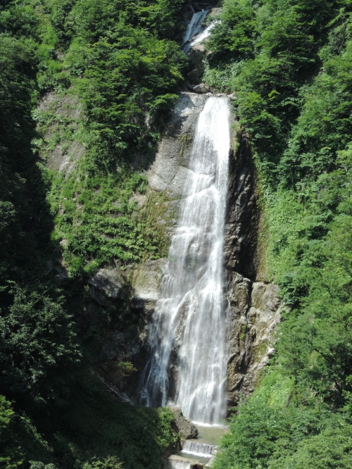 白山白川郷ホワイトロード沿線上の駐車場から望める、落差86mの滝です。垂直に切り立った崖を一気に流れ落ちる姿は圧巻。水量が多くなる春先などは水しぶきで濡れる場合もあります。