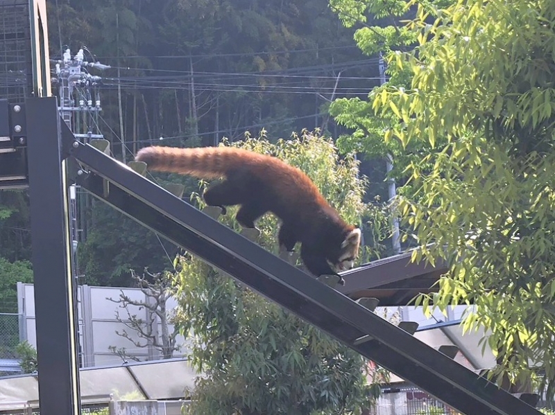 レッサーパンダは、樹木などが植えられた屋外と、隣のビジターセンターの中にある展示場との通路を自由に動き回っています。外に見えなかったら、ビジターセンターの中を見てくださいね。