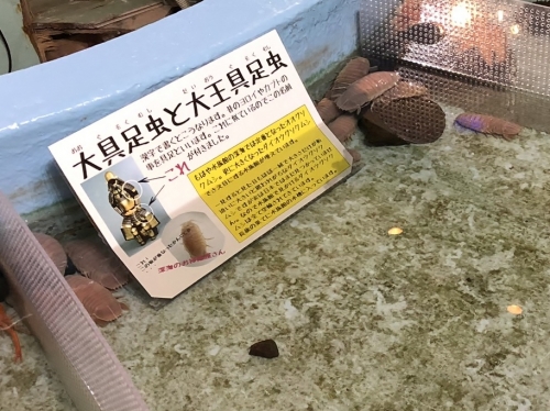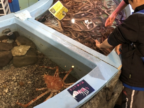 水族館の中でも特におすすめは、2階のふれあい水槽。時期によって入っている生き物が変わることもあるそうですが、他の水族館ではあまり見たことがないものに触れます。このときは、ヒトデ、ナマコ、ウニといった見覚えのある生き物の他、ヌタウナギ、タカアシガニ、グソクムシもいました。