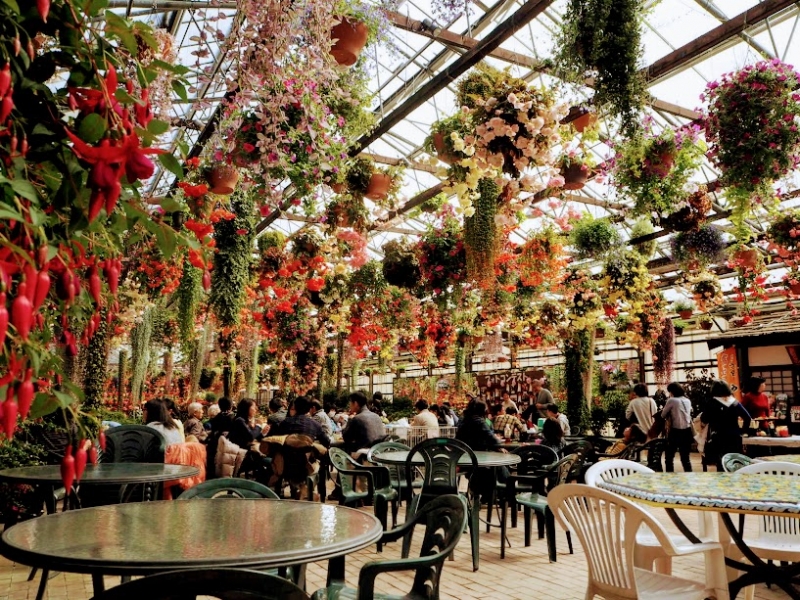 最後に紹介する見所はなんといっても園内の植物の鮮やかさです。一般の家庭ではまず見ることのできない天井から吊るされた鉢からのびるカラフルな花々は、まるで花の滝の様です。