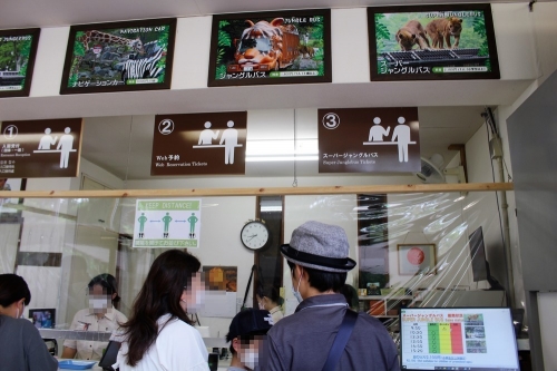 次は、有料のジャングルバスに乗り換えてサファリゾーンを回るコースです。ジャングルバスに乗るには当日予約が必要なため(事前予約不可)、エントランスゲートを通過した後すぐに右折し、予約&発券所へ向かいましょう。GWや夏休みなどの繁忙期は早い時間から予約が埋まってしまうので、朝イチの予約をおすすめします。
