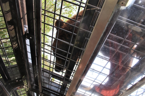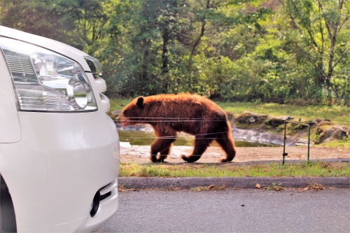 ガイドさんの解説を聞きながらマイカーと同様のコースを走り、「クマゾーン」のエサ場に着いた瞬間に、大型のクマがやって来ました。車の形状と独特な音の合図で「エサの時間だ」と分かるようで、クマがのしのしと近づいてきて、ためらいもせずに天井にジャンプ!