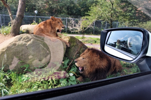 続いては「ライオンゾーン」です。こちらも車のすぐ近くまでライオンが来るのでちょっと緊張しますが、その表情は至って平穏なもの。あくびをしたりゴロゴロ寝ている姿は“大きなネコ”といった感じで、可愛らしくもあります。