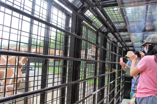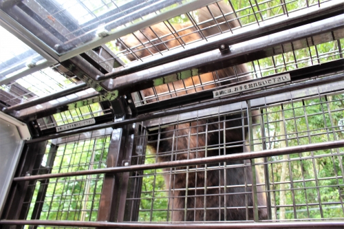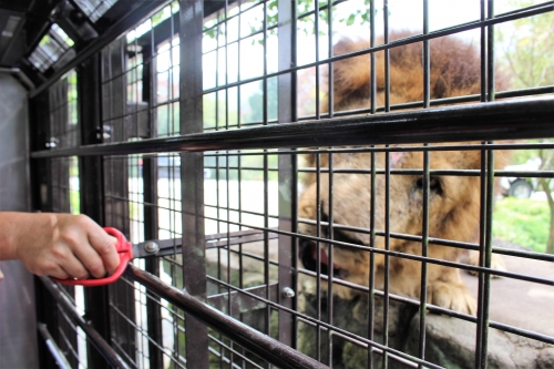 一気に獣臭さがただよい、すごい迫力です。エサやりの時は席から立って自由に歩き回ってOKで、天井の金網の隙間からエサを突き出すと、クマの方から寄ってきてパクリと食べてくれます。大きな口から牙が覗き、車内は大人も子供もキャーキャー大盛り上がりに!